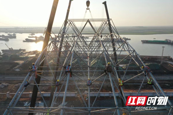 10月19日,在岳陽城陵磯老港環保提質改造項目工地上,湖南省單跨徑最大、最高螺栓球鋼網架散貨大棚——長470米,單跨跨經110米、高46.5米,首段起步網架(16米長、110米跨經)成功完成。晚上7點,當最后一根支架和連接球安裝完畢,項目現場響起了一片歡呼。